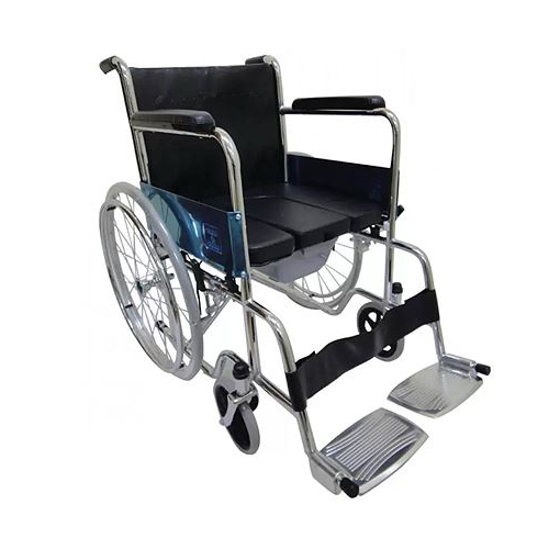 Our wheeled commode chair offers tool-free height adjustment and tool-free disassembly for easy portability. These allow for the commode chair to be used as a raised toilet seat or a toilet safety frame. This particular commode chair offers a removable white splash guard and grey plastic bucket for easy cleaning.